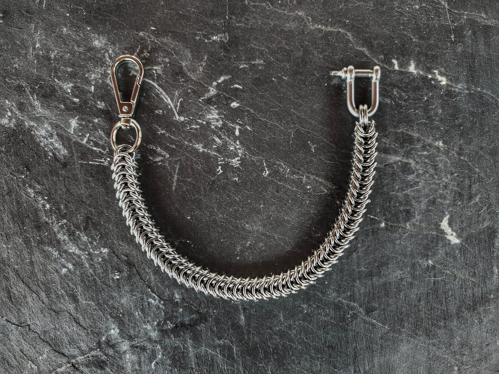 - Técnica artesanal: Cota de malla tejida a mano en patrón cúbico